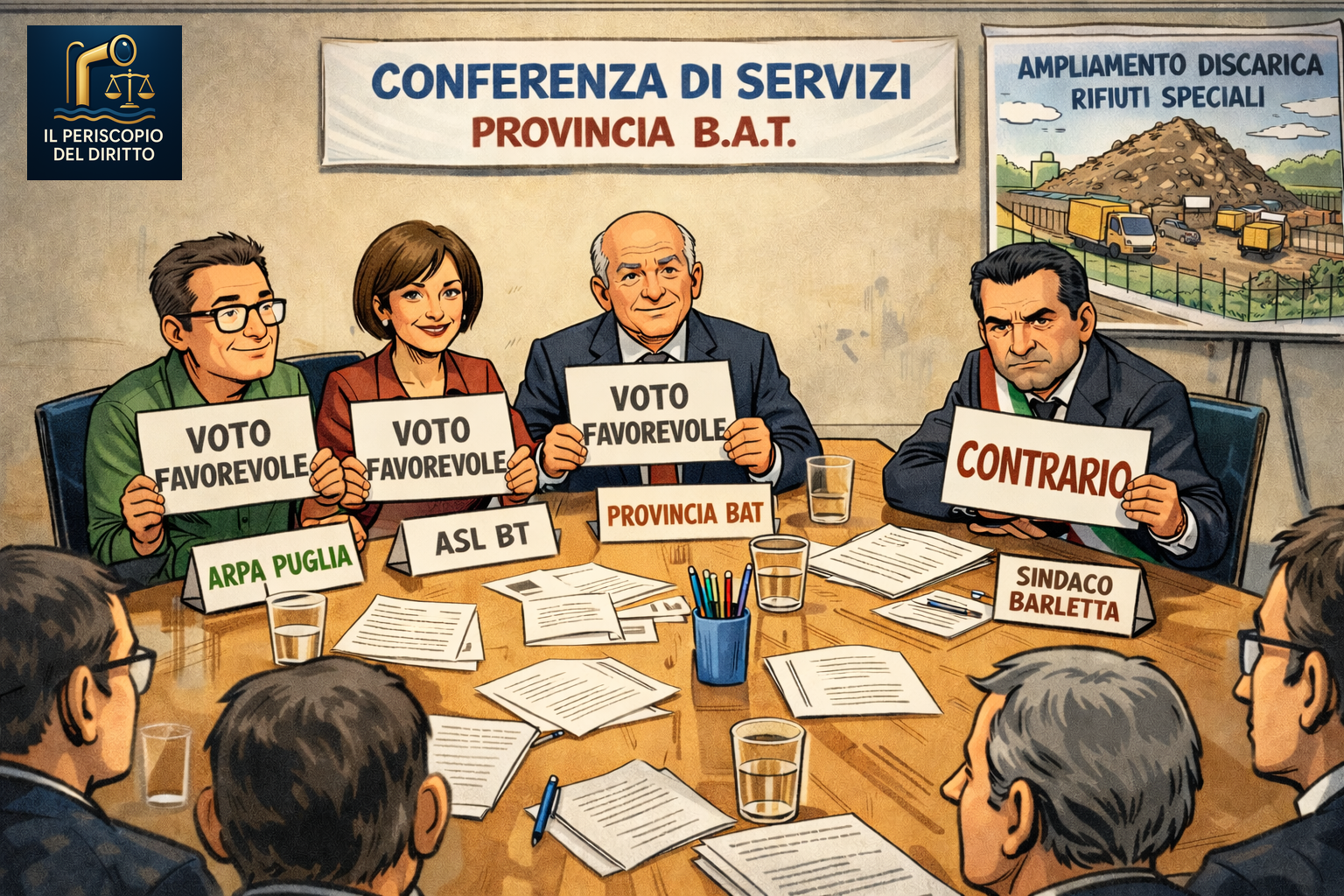 Nella conferenza di servizi convocata dalla Provincia BAT, ARPA Puglia, ASL e altri soggetti tecnici hanno dato voto favorevole, mentre il rappresentante del Comune ha manifestato dissenso. In questi casi il procedimento amministrativo può proseguire anche in presenza di posizioni contrastanti.